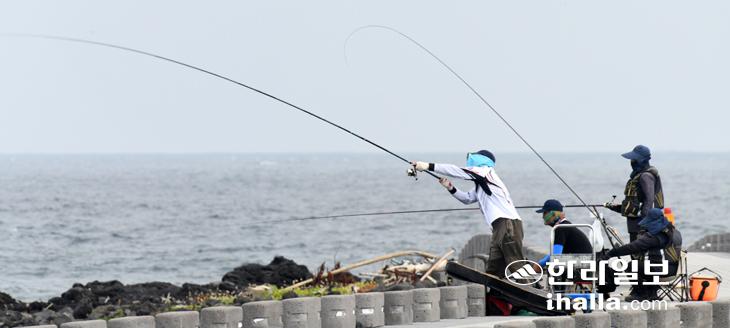 27일 제주시 구좌읍 김녕바다에서 낚시꾼들이 따가운 햇살을 견디며 대어를 기다리고 있다. 이상국기자