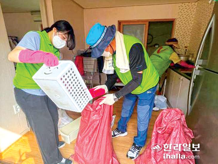 제주시 화북동 주민센터는 지난 23일 제주사회복지협의회 소속 자원봉사연합회(회장 문영호)와 함께 독거노인 가구 중 주거환경이 열악한 가구를 선정해 쓰레기 처리, 장판 교체 등의 주거환경개선사업을 진행했다.
