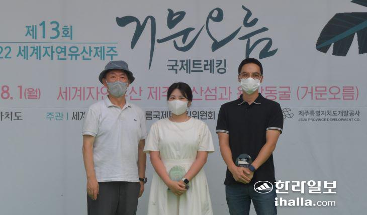 '거문오름 국제트레킹 홍보대사'로 위촉된 오인영(가운데) 씨와 안재민(오른쪽) 씨. 이상국기자
