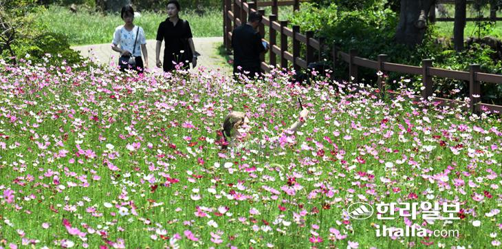 28일 제주시 동한두기 용연 인근 공한지에 코스모스꽃이 활짝 꽃망울을 터뜨려 더위에 지친 시민과 관광객들에게 색다른 볼거리를 제공하고 있다. 강희만기자