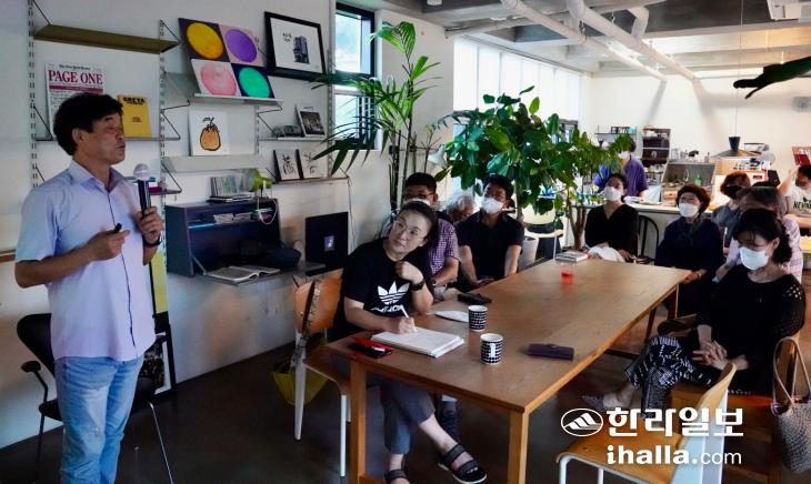 '한라산이 기억하는 사람'이라는 주제로 강연하는 강시영 제주환경문화원장. 사진=인터뷰책방