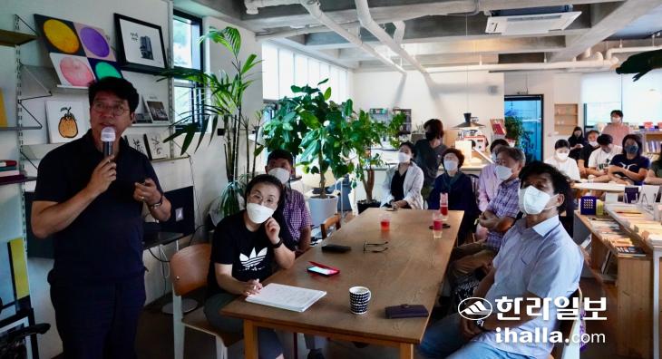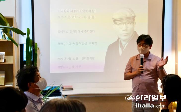 지난 30일 서귀포시 서호동 인터뷰책방에서 열린 '문화도시 책방데이'에서 강시영 제주환경문화원장이 부종휴 선생에 대해 이야기하고 있다. 사진=인터뷰책방