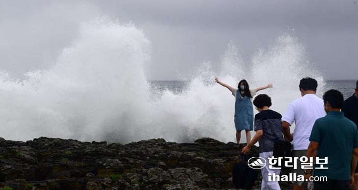 1일 제6호 태풍 '트라세'의 영향으로 높은 파도가 밀려온 서귀포시 대정읍 신도리 해안을 찾은 관광객들이 파도를 배경으로 사진을 찍으며 즐거워 하고 있다. 강희만기자
