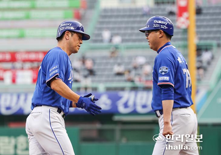 삼성 라이온스에서 활약중인 강민호 선수(왼쪽)와 박진만 감독대행. 연합뉴스