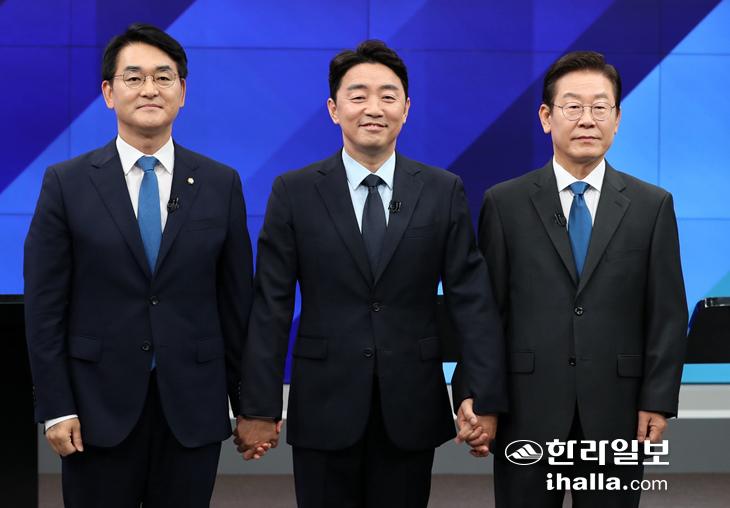 2일 열린 더불어민주당 당 대표 후보자 초청 토론회. 박용진(왼쪽부터), 강훈식, 이재명 후보. 연합뉴스