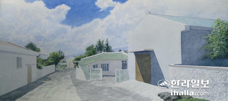 소박한 농촌마을 길을 걸어가다 만난 찬란한 하늘. 며칠 뒤에 태풍이 온다는 소식이 있어서일까 두꺼운 구름층이 마을 위로 몰려와 있고 찢어진 사이로 청명한 하늘색이 짙게 드러나 내리쬐는 태양광선이 눈부신 향연을 베풀고 있다. 화면에 등장하는 집이 셋이요 창고 건물 또한 셋이다. 태흥1리의 경지 면적 중에 9할 이상이 감귤 과수원이며 그 중에 하우스 시설 재배 면적 또한 엄청 많다. 시설농업에 필요한 각종 자재며 장비들을 보관하고 관리할 집이 필요한 것. 이 마을의 현주소를 흰구름 덕택에 그리게 됐다. 하늘색이 짙은 만큼 땅 위에 그림자도 짙다. 우리의 시각 경험이 발휘하는 더욱 강렬하게 시도된 것에 대한 적응을 가능하게 한다는 사실. 길은 고요하지만 하늘은 몹시 바쁘게 움직이는 강렬한 청백의 대비를 보여준다. 굳이 정중동을 노래하지 않아도 화면이 알아서 들려주는 그런 눈부신 환희를 표현하고자 했다. 평면적 상황으로 보면 분할이 지닌 면적 대비에 농도 차이를 부여해 극적인 구성을 시도한 것. 오른쪽 앞에 큰 건물 벽이 환한 색이어서 구름의 명도와 별반 다르지 않다. 하늘의 밝음이 저 벽을 타고 지상으로 내려와 많은 곳을 밝혀주는 이미지를 구축하려 의도하였다. 감귤맛, 그 품질에 영향을 주는 요인 중에 일조량이 가지는 의미는 실로 크다고 한다. 이런 청정햇살 아래 자라는 감귤들이니 맛 품질이 당연히 높겠다는 과도한 생각을 하며 붓질을 했다. 농촌현실을 보여주는 마을 안길의 8월이 눈부시다.