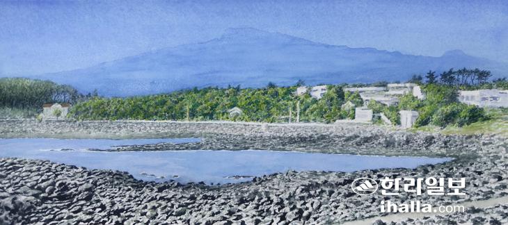 해안도로를 따라 가다 벌포연대 앞 해변으로 내려가서 한라산을 바라보면 오묘한 편안함을 만난다. 활처럼 휘어져 깊이 들어간 구조이기 때문에 다양한 시각적 요인들이 발생한다. 파도에 의해 오랜 기간 부서져 마모된 바윗덩어리들과 아직 버티고 있는 암반층들이 위치에 따른 명암의 변화를 보여주고 바다로 경사진 지형이 휘어져 바다를 감상하는 노천극장을 닮았다. 그 뒤에 파르테논신전 지붕 물매 각도와 흡사한 위엄과 신성함으로 자리 잡은 한라산. 무게감으로 와 닿는 이 섬의 중심이 화면의 정점이기도 하다. 해안가에 밝게 빛나는 빛의 강도를 높이기 위해, 또한 거리감을 증폭시키기 위해 하늘이 보유한 대기 속으로 깊이 밀어 넣었다. 하늘과 한 덩어리가 될 정도로 명도 차이를 줄이면 화면의 상층부가 면적대비 효과를 가지고 해변의 광선 강도를 더욱 높여줄 수 있다. 조용한 공간곡선의 변화가 있다. 짙은 초록의 나무들이 하얀색 집과 집 사이에서 자연미를 뽐내며 코러스를 넣고 있다. 파도와 만나는 지점의 돌들은 미세한 차이를 지녔다. 회화적 관심영역으로 파악했을 때, 물에 젖은 색과 뙤약볕을 반사하는 돌들의 색의 차이를 통하여 현실감을 얻게 된다. 섬 제주의 자연적인 요소가 망라된 느낌이다. 거기에 사람이 구축한 토목과 건축물까지 함께 모여서 자신의 이기적인 존재감보다 전체의 하모니를 위해 헌신하고 있다. 한라산 배경으로 어떤 장엄한 교향곡이 시각화 된 느낌을 받는 곳이다. 태흥1리―크게 흥하는 바닷가에서.