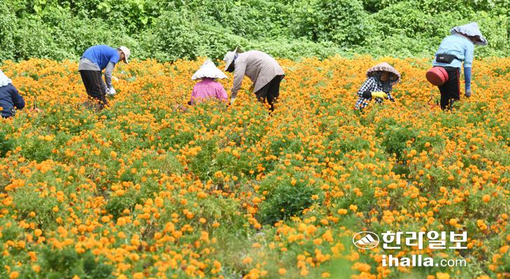 4일 서귀포시 대정읍 한 밭에서 농민들이 한낮의 뜨거운 열기를 이겨내며 메리골드를 수확하고있다. 메리골드는 국화과의 천수국속의 식물을 통칭한다. 꽃말은 우정, 예언이다. 이상국기자
