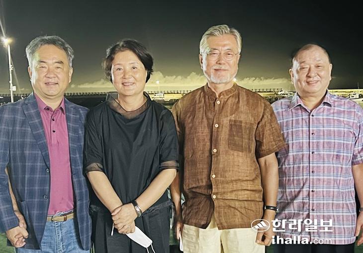 지난 3일 서귀포시 표선 포구에서 문재인 전 대통령과 김정숙 여사가 송재호 국회의원(사진 맨 왼쪽), 강창일 전 주일대사(사진 맨 오른쪽)와 함께 기념 촬영을 하고 있다. 송재호 의원 제공