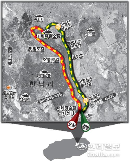 지난달 22일 진행된 한라일보의 '2022년 제주섬 글로벌 에코투어' 5차 행사의 코스는 서귀포시 남원읍 한남리 머체왓숲길 방문객지원센터를 출발해 족은거린오름까지 이어지는 길이다. 머체왓숲길을 지나 서중천을 건너 서중천변을 따라 오르다 다시 서중천을 건너 족은거린오름을 오른다. 족은거린오름을 지나면 옛 임도를 만나는데, 임도를 따라 내려가면 머체왓 소롱콧길과 만나고 그 길을 따라 출발지로 돌아오는 코스다. 이번 투어 역시 코로나19가 재확산하는 상황이어서 비대면으로 최소한의 인원만 참석한 가운데 진행됐다.