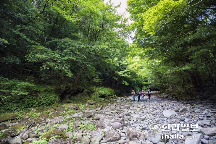 길을 따라 한참을 오르면 서중천 전망대를 만난다. 전망대에서 보이는 하천 바닥은 커다란 바위들로 덮여 있다. 마치 물이 흐르고 있는 듯한 모양의 바위들이다. 하천변 길은 끊어진 듯 이어지고, 이어졌다 끊어진다. 족은거린오름을 오르려면 서중천을 다시 건너야 한다. 하천 바닥 마른 바위에 걸터앉아 잠시 눈을 감는다. 물소리가 들린다. 바위에는 각종 이끼와 고란초가 사이좋게 자란다. 까마귀가 우짖고 지나가는 계곡엔 바람이 무더위를 식혀준다. 서중천을 건너 족은거린오름으로 이어지는 길로 들어섰다. 이제는 서중천과 헤어져 오름을 향한다. 다소 완만하게 느껴지는 길은 오름 북쪽 능선을 감아 돌며 정상으로 이어진다.