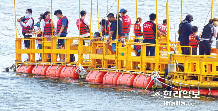 8일 제주시 한림읍 수원리 인근 바닷가를 찾은 관광객들이 찜통 더위속에 제주전통 대나무 낚시체험을 하고 있다. 강희만기자