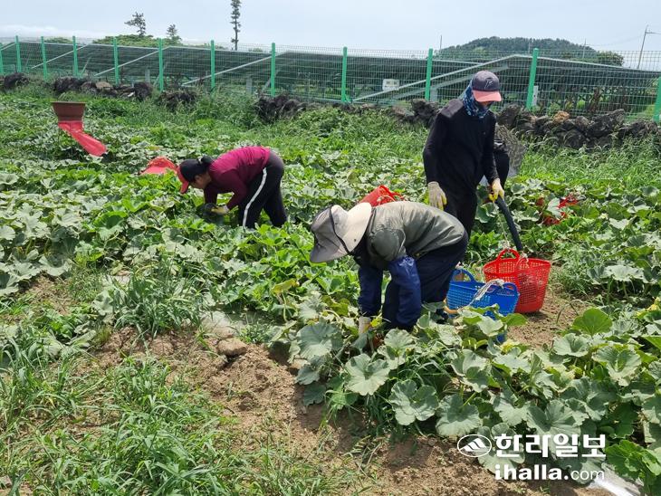 외국인 근로자들이 도내 한 밭에서 일을 하고 있다.