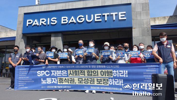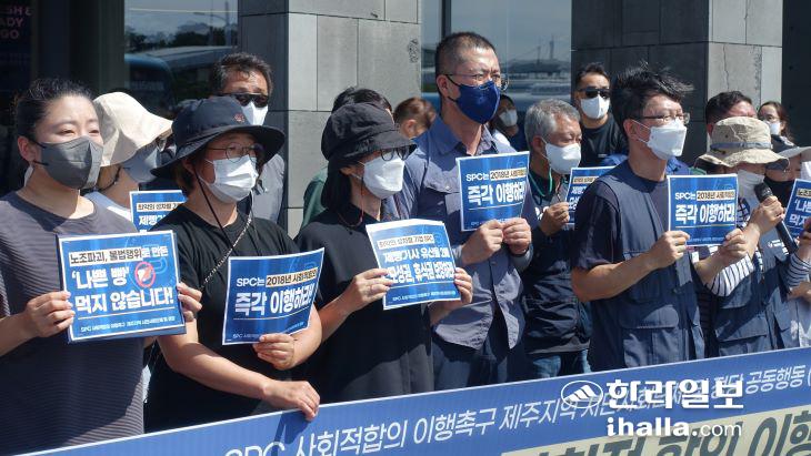 SPC 사회적 합의 이행을 촉구하는 제주지역 시민사회단체 및 정당 일동 관계자들이 9일 제주공항 렌터카하우스 앞에서 기자회견을 열고 있다. 김도영기자