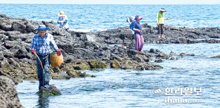 9일 제주시 구좌읍 월정리해안에서 주민들이 돌 틈 사이로 물고기를 잡아올리는 구멍낚시를 하고 있다. 강희만기자