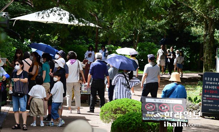 10일 계속되는 폭염날씨속에 제주시 구좌읍 비자림에 많은 관광객들이 찾아 시원한 숲트레킹에 나서고 있다. 강희만기자