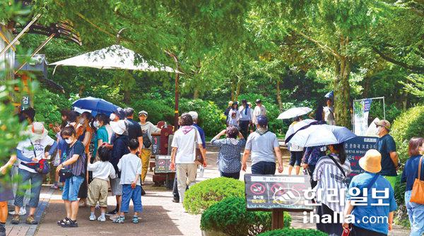 10일 계속되는 폭염날씨 속에 제주시 구좌읍 비자림을 찾은 관광객들이 시원한 숲트레킹에 나서고 있다. 강희만기자