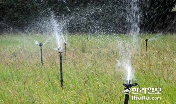 11일 제주시 한경면 고산리 한 밭에 아침부터 스프링클러가 쉼없이 돌아가며 물을 뿌리고 있다. 강희만기자