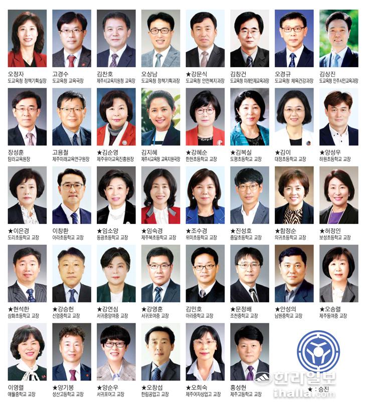 ▶교장 ▷중문고 강명화 ▷제주제일고 김월룡 ▷탐라중 오정보 ▷제주외국어고 이영철 ▷제주과학고 이창훈 ▷세화고 진규섭 ▶교감 ▷성산중 김성룡 ▷제주제일중 양용혁 ▷함덕중 조현숙 ▷탐라중 홍향숙 ▶교육전문직원 ▷도교육청 미래인재교육과장 김창건 ▷정책기획과 김우철 ▷국제교육협력과 김성태 ▷교원인사과 김동국