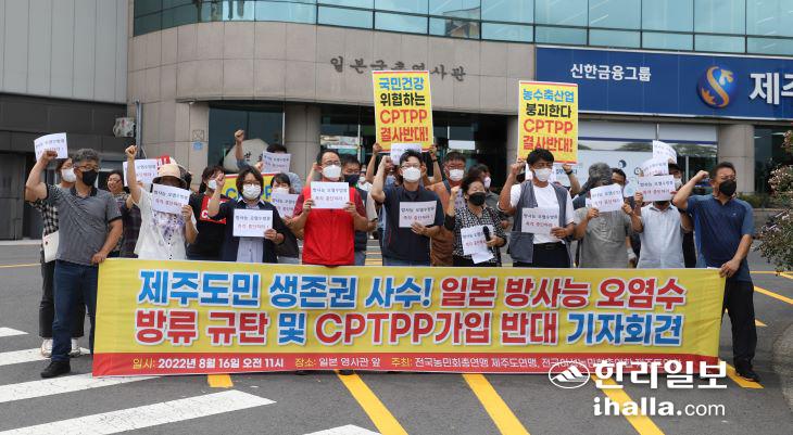 제주지역 농민단체 관계자들이 16일 주제주일본총영사관 앞에서 기자회견을 열고 있다.