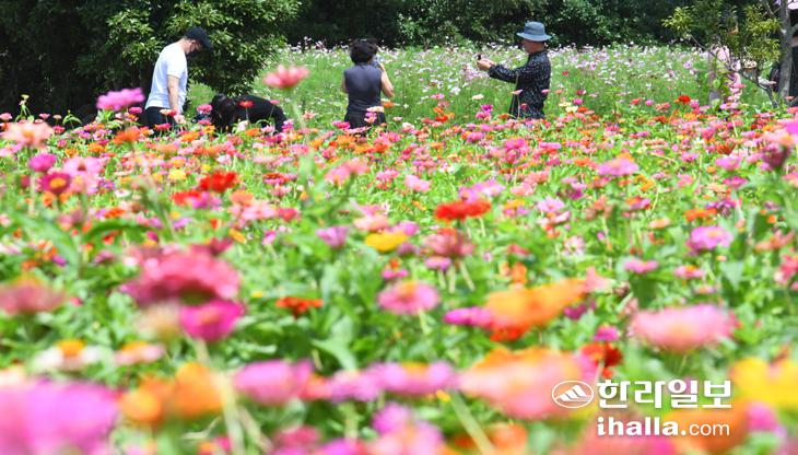 18일 제주시 애월읍 항파두리 항몽유적지를 찾은 관광객들이 활짝 피어난 백일홍과 코스모스를 배경으로 기념촬영을 하고 있다. 이상국기자