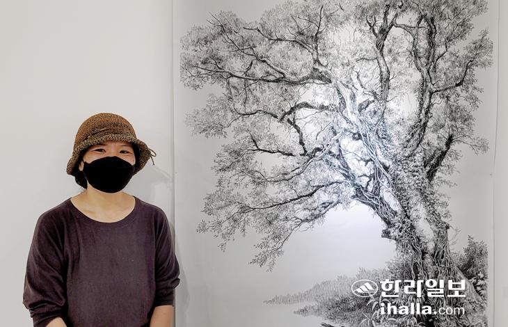 김영화 작가. 제주시 관덕로에 위치한 갤러리 '포지션 민 제주'에서 오는 23일까지 작가의 그림책 원화를 만날 수 있는 펜그림전 '무등이왓에 부는 바람'이 열린다. 오은지기자