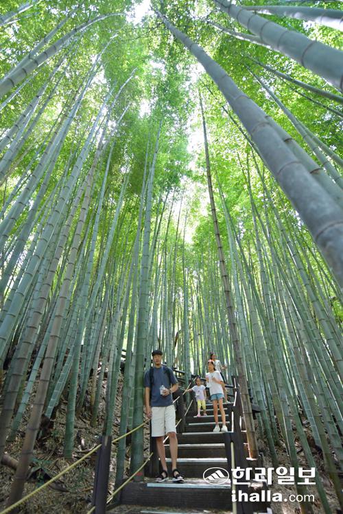 8일 제주시 한라수목원을 찾은 관광객들이 더위를 피해 시원한 대나무 숲을 걷고 있다. 이상국기자