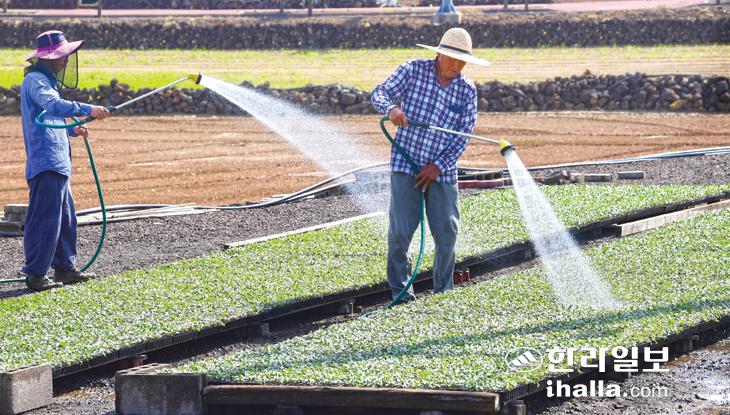 21일 제주시 한경면 용수리 한 농가에서 무더운 날씨 속에서 양배추 모종에 물을 주고 있다. 강희만기자