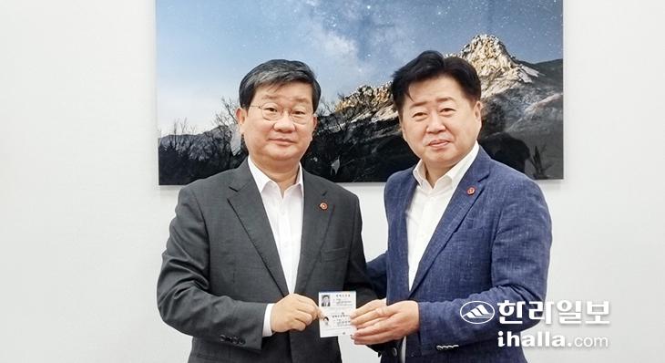 오영훈 제주특별자치도지사는 지난 19일 서울 여의도 국회에서 전해철 환경노동위원회 위원장(더불어민주당·경기 안산시상록구갑, 전 행정안전부 장관)을 만나 명예도민증을 전달했다. 제주도는 전해철 위원장이 행정안전부 장관 재직시절 4·3특별법 전부개정 및 일부개정 등 4·3의 정의로운 해결에 큰 관심을 기울여 준 것에 감사하는 의미로 명예도민을 수여했다고 설명했다.