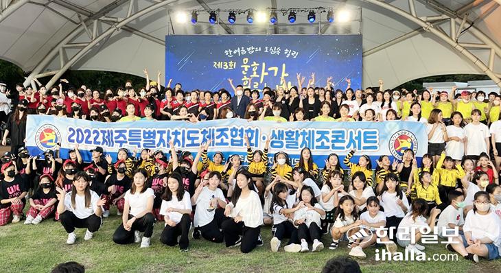 제주특별자치도체조협회(회장 강창용)는 지난 21일 제주시민복지타운 야외공연장에서 16개팀 250여명이 참가한 가운데 2022 제주특별자치도체조협회 생활체조콘서트를 개최했다. 강창용 회장은 "이번 생활체조 콘서트 개최를 통해 무더위에 지친 도민들에게 힐링의 시간이 되길 바라며, 남녀노소를 불문하고 다양한 계층이 생활체조를 즐기면서 건강하고 활력넘치는 지역사회가 되기를 소망한다"고 말했다.