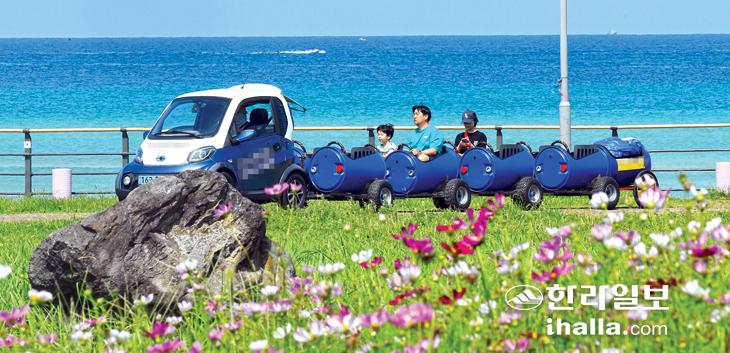 22일 제주시 구좌읍 김녕해수욕장을 찾은 관광객들이 깡통열차를 타며 즐거운 추억을 만들고 있다. 이상국기자