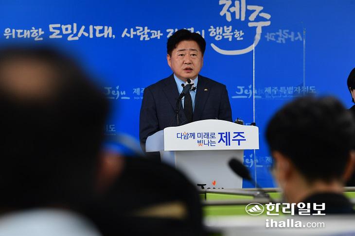 오영훈 지사는 23일 제주도청 기자실에서 기자회견을 열고 "야당 도지사가 순탄할 것이라 생각해본 적 없다"며 "제주도민이 주신 권한과 책임을 흔들림 없이 수행하겠다. 이런 과정에서 문제가 없을 것이라 확신한다"고 밝혔다. 강희만기자
