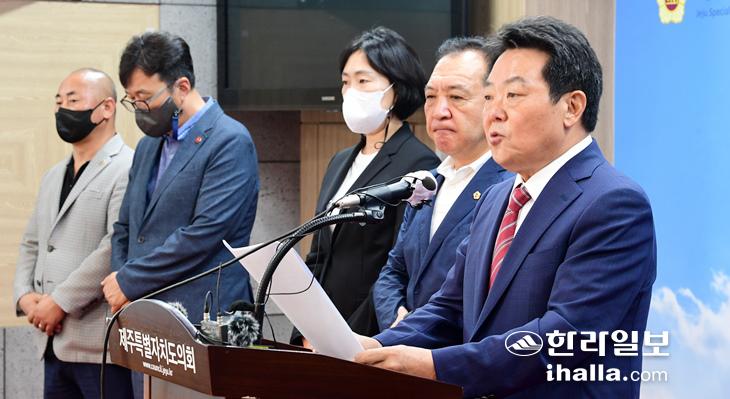 강병삼 제주시장과 이종우 서귀포시장 임명에 따른 기자회견을 하는 국민의힘 허용진 제주도당위원장. 강희만기자