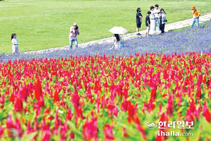 23일 제주시 표선면 보롬왓을 방문한 관광객들이 아름답게 피어있는 맨드라미를 배경으로 기념사진을 찍고 있다. 이상국기자