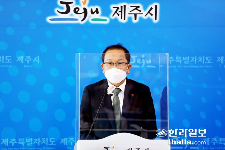 24일 기자실을 찾은 강병삼 제주시장이 농지법 위반 의혹 등이 있는 토지 처분 계획 등에 대한 기자들의 질의에 답하고 있다. 사진=제주시