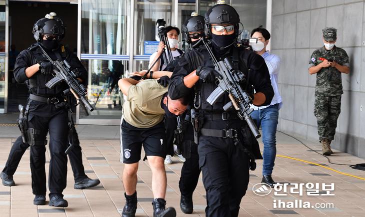 제주소방서는 24일 제주항 국제여객터미널에서 '긴급구조종합훈련'을 실시했다. 강희만기자