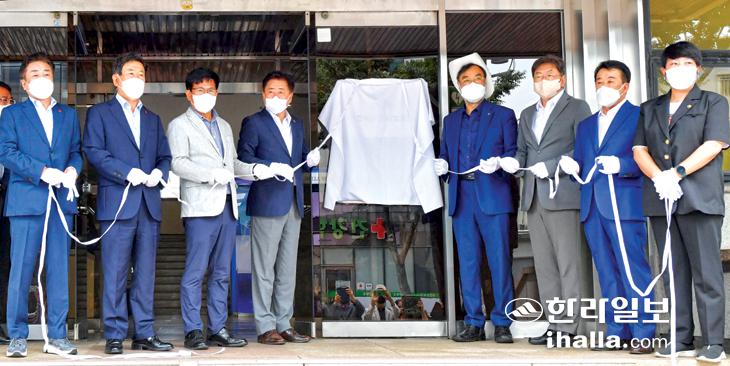 24일 한라일보에서 열린 국제미래학회 '제주미래창의캠퍼스'현판식에서 참석자들이 기념촬영을 하고 있다. 사진 왼쪽부터 양경호 도의회 예결위원장, 김광수 도교육감, 김경학 도의회 의장, 오영훈 제주지사, 안종배 국제미래학회장, 이남식 서울예술대학교 13대 총장, 김건일 한라일보 대표이사, 홍인숙 도의원. 이상국기자