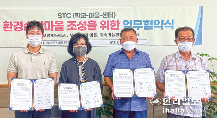 지속가능환경교육센터(제주특별자치도환경교육센터)는 지난 19일 무릉초등학교에서 지역사회의 자원순환 인식 제고와 실천 확산을 통한 지역 중심의 탄소중립 실현과 기후위기와 환경오염, 생태계 파괴로부터 안전하고 청정한 환경순환마을 조성을 위해 무릉초등학교, 무릉1·2리와 STC(학교-마을-센터) 환경순환마을 조성을 위한 업무협약을 체결했다.