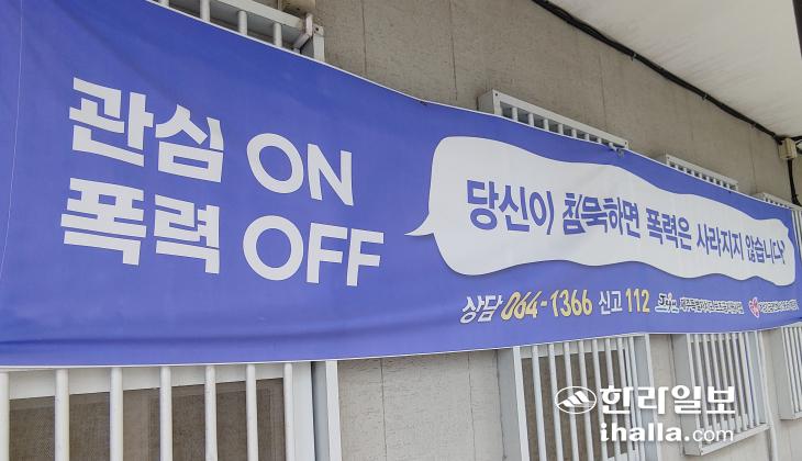 여성긴급전화 1366제주센터 홍보 현수막. 1366센터는 가정폭력, 성폭력, 성매매, 스토킹 등에 대한 긴급 상담과 피해자 보호 역할을 하고 있다. 관련 피해를 입었다면 주저하지 말고 064-1366으로 전화하면 된다. 김지은기자