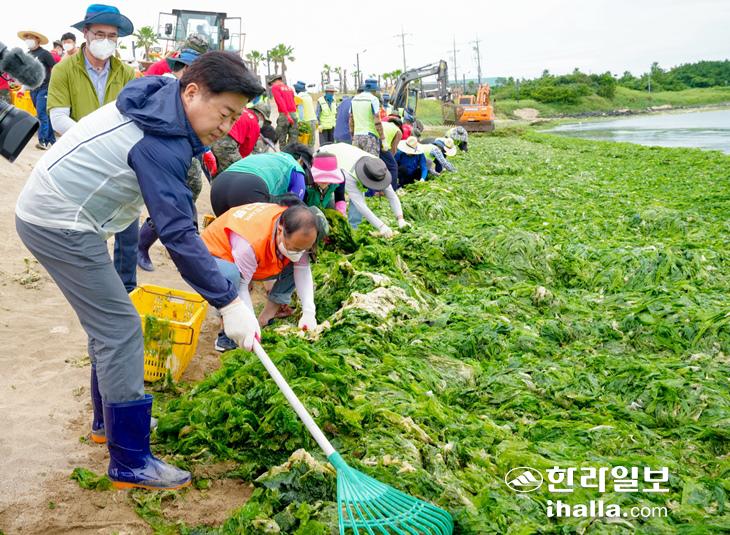 [한라일보] 오영훈 제주지사가 26일 파래로 골치를 앓고 있는 서귀포시 성산읍 신양섭지해수욕장을 찾아 수거활동을 전개했다.