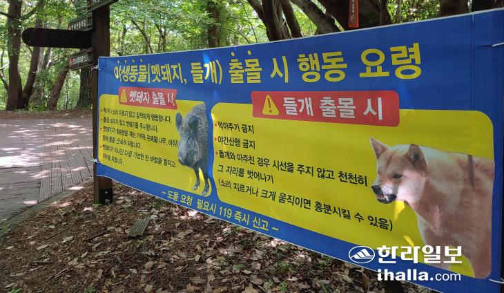 제주 한라산 둘레길 탐방로에 멧돼지와 들개에 대한 주의를 당부하는 현수막이 걸려 있다. 김지은기자