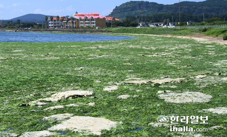 30일 제주시 구좌읍 종달리 해안가에 엄청난 양의 파래가 떠밀려와 악취와 함께 미관을 해치고 있다. 강희만기자