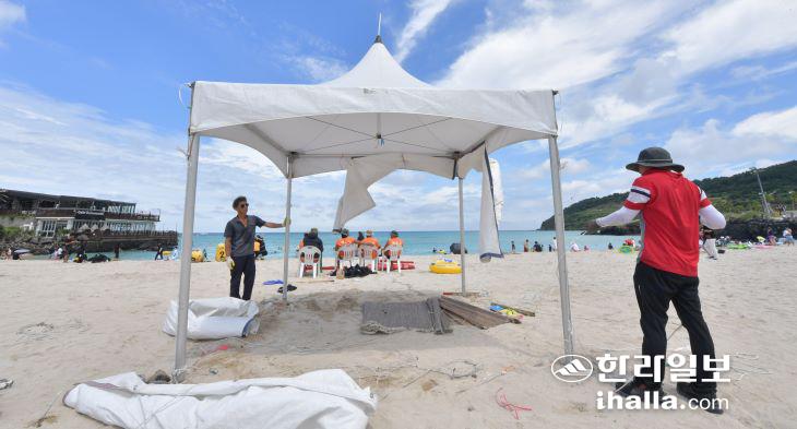 31일 제주시 조천읍 함덕해수욕장 관계자들이 해수욕장 폐장에 앞서 시설물을 철거하고 있다. 이상국기자