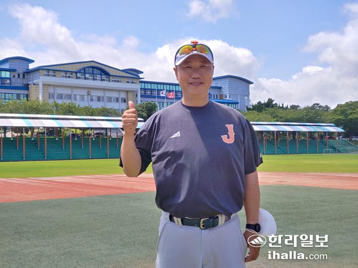 제주고 야구부를 이끌고 있는 박재현 감독이 학교 야구장에서 포즈를 취하고 있다. 그는 '제주 야구'가 자립할 수 있는 선순환이 필요하다고 강조했다. 김지은기자