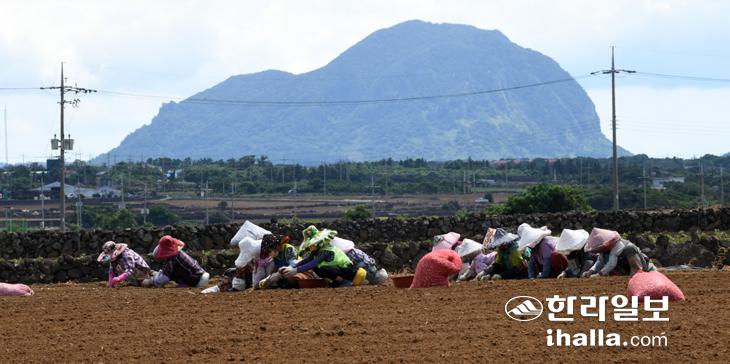 31일 산방산을 곁에 둔 서귀포시 대정읍 무릉리 농경지에서 농민들이 마늘 모종 파종을 하고 있다. 강희만기자
