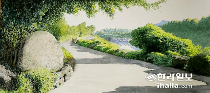 우금 가는 길<수채화 79cm×35cm>섬 제주를 가장 아름답게 하는 것은 길이라는 표현에 공감하게 되는 곳이 있다면 여기 망오름 서쪽 냇가로 난 이 길을 보여줄 것이다. 경이로운 풍광이 있는 것도 아니며, 특출하게 뛰어난 그 무엇이 있는 것도 아니다. 그런데도 묘한 매력이 있다. 정감이라고나 할까. 좋은 사람과 손잡고 걸어가고 싶은 그런 길이다. 이 길로 내려가면 우금포와 쇠소깍이 있는 바다가 나온다. 바다가 가까이 있음에도 바다가 보이지 않는, 냇가 옆으로 따라가는 길이다. 처서가 지났지만 아직도 맹하의 뜨거운 태양이 서쪽으로 기울면서도 강렬하다. 왕성한 초록의 향연을 눈부신 햇살로 거대한 원근의 짜임 속에서 펼치고 있는 중이다. 냇가의 바위들 모두가 자연이 빚은 조형물들이다. 그 귀중한 예술품을 감상하며 걸어가는 길. 넓지 않아서 좋다. 그래서 오래 걸을 수 있을 것 같다. 꾸밀 이유도 없다. 옆에 하천이 모두 알아서 해줄 것이니까. 그리는 내내 '아직'이라는 단어가 맴돌았다. 아직까지는 그래도 제주의 옛 길이 남아 있다는 그러한 향수. 남쪽 대로변에서 우금포까지 가는 이 길은 낭만주의자들을 위해 영원히 남겨뒀으면 하는 소망을 그림 속 태양광선처럼 뜨겁게 담았다. 필자는 이 길은 심하게 좋아하여 폭우가 내린 뒷날이면 찾아가 물흐르는 소리를 듣는다. 꾸밈없는 청량감으로 와 닿는다. 하례1리 조상님들이 부르던 명칭이 너무 정겹다. '우금 가는 길'. 우금의 의미가 그냥 포구가 아니라. 뭔지 모를 궁금함을 향하여 가는 길이라 여기면서.