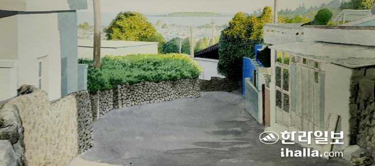 한가름길에서 지귀도를 보며<수채화 79cm×35cm>오르막 길 위에서 늦은 오후의 햇살을 받은 멀리 지귀도(속칭 찌꾸섬)을 바라보다가 집이며 나무, 그리고 전봇대에 이르기까지 다양하게 광선공간을 연출하고 있는 모습을 발견하여 그 풍성한 시간성을 표현하였다. 리사무소 건물 앞이다. 마을 어르신들의 말씀에 의하면 설촌 당시부터 오래된 성씨들의 장손들 집이 이 부근에 대부분 있다고 한다. 중심지였다는 의미로 읽힌다. 마을 전체가 집이면 바다는 마당이다. 앞마당에 섬 하나가 떠있다. 하례1리 옛 조상들이 이 높은 지대에 주로 집을 지은 이유가 혹시 이 풍광을 탐하여 지었던 것은 아닐까? 오르막과 내리막을 힘든 불편함이라고 생각하지 않았던 시대의 삶을 반추한다. 조상들도 그렇게 살았으니 나도 당연히 그렇게 살고 있다는 행복한 숙명론을 떠올리며 그렸다. 근경 오른쪽 집 유리창에 반사된 과수원의 빛은 어찌 이리도 소중하게 느껴지는 지. 거대한 그림자 속에 내리막길은 내려가고 있고 빛의 각도들이 생성시키는 공간감들이 모여들어서 화면 전체의 현장감을 그려낸다. 태양 빛을 받는 모든 존재는 소중한 가치를 지녔다는 찬미를 돌담에서부터 지붕에 이르기까지 부여하며 하루의 의미를 되새겼다. 눈부신 광선 속에 가둬진 저기 지귀도는 평화로움 자체가 바다에 떠있는 것. 도식화 된 구도로 설명될 수 없는 시각적 상황을 빛의 시간성은 극복하고 또한 더욱 아름다운 가능성을 발견하여 열어간다. 같은 장소가 다른 시간에 의해 다르게 느껴지는 이치를 여기에서 새삼 다시 느낀다.