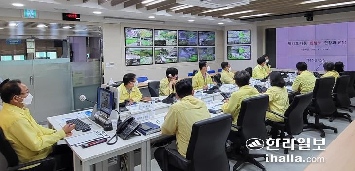 2일 제주시 재난안전상황실에서 태풍 북상에 대비한 상황판단회의가 열리고 있다. 사진=제주시