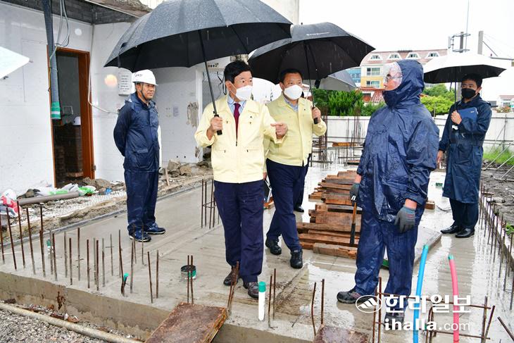 김광수 교육감이 2일 제주중앙중학교를 찾아 학교 시설물 안전 등 태풍 대비 현황을 점검하고 있다. 사진=제주도교육청