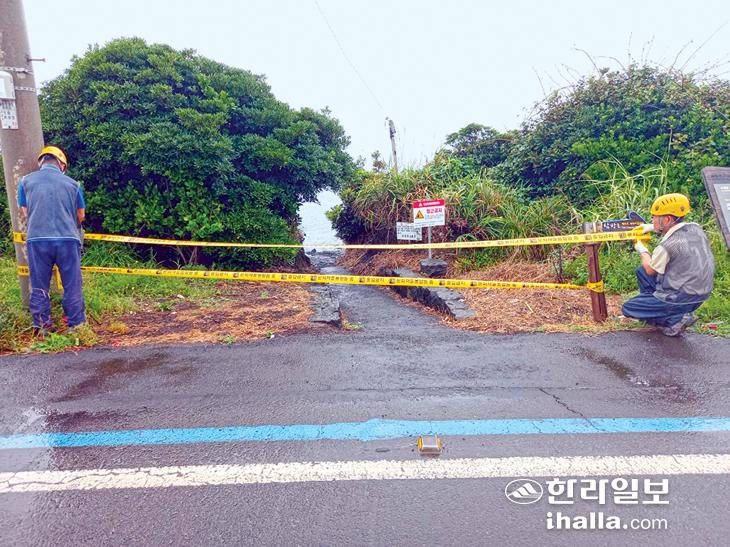 제주자연문화재돌봄센터(센터장 강영제)는 11호 태풍 힌남노 상륙을 앞두고 낙석 등 강한 비바람에 의한 피해를 대비해 납읍리 난대림, 수월봉 화산쇄설층 등 일부 구간에 출입 통제 안전띠 및 안전 표지를 설치했다.